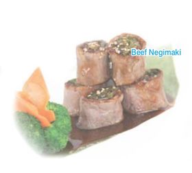 Tuna, Salmon, yellowtail, asparagus with avocado inside topped with seared, steak and radish sprouts.