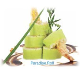 Shirmp tempura, asparagus, avocado, spicy tuna inside wrapped w. white soybean seaweed.